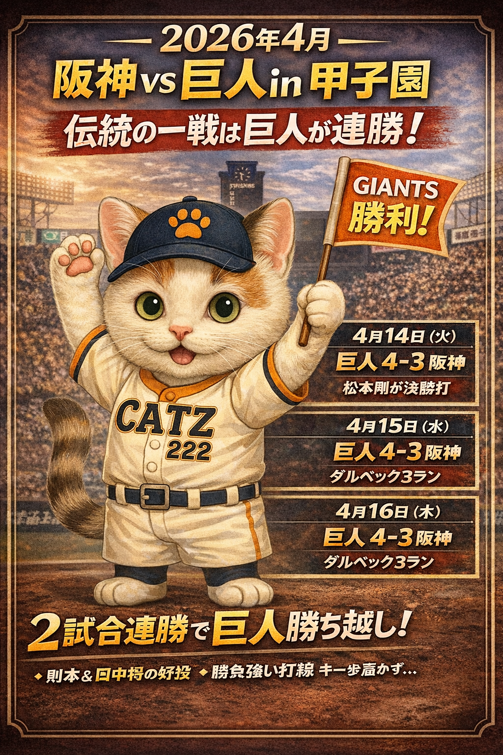 2026年4月14日〜16日に行われた、阪神タイガース vs 読売ジャイアンツの「伝統の一戦(甲子園)」は、巨人が2勝0敗(1試合中止)で勝ち越しという結果になりました。