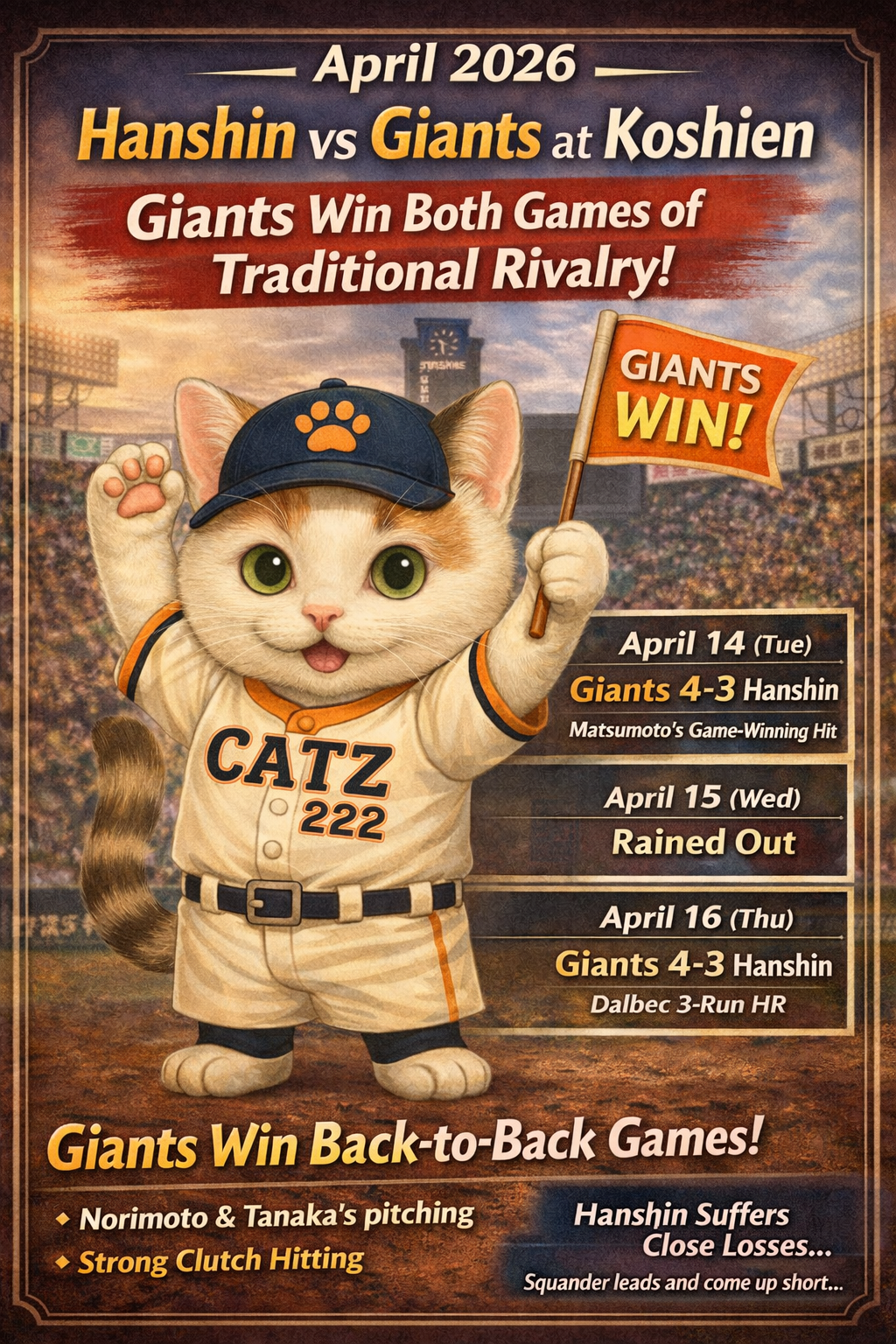 The iconic “Tradition of the Game” series between the Hanshin Tigers and the Yomiuri Giants took place from April 14–16, 2026, at Koshien Stadium. The Giants emerged victorious, winning the series 2–0 (with one game rained out).