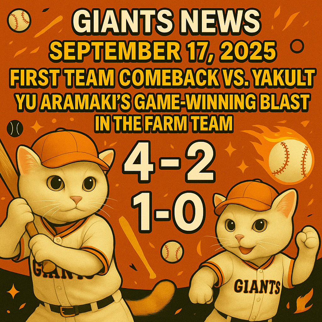 [Giants News] first-team and farm-team games on September 17, 2025. With the season nearing its climax, every win matters! 🏟 First Team: Comeback Victory at Jingu The Giants defeated the Yakult Swallows 4-2 at Jingu Stadium. * Yakult scored 2 in the 1st inning, but the Giants tied in the 2nd and added runs in the 3rd and 5th. * Starter Shohei Togo pitched with poise, and closer Martinez sealed the win. Fans on X cheered: “Losing streak over! Time to fight for 2nd place!” 🔥 Farm Team: Yu Aramaki Shines with a Big Home Run In the Eastern League, the Giants’ farm team edged Seibu 1-0. * Teppei Mataki threw 6 scoreless innings, with solid relief from Takahashi, Baldonado, and Kikuchi. * Hernandez had a multi-hit game after returning from injury. * The spotlight was on 22-year-old infielder Yu Aramaki, who launched a towering homer to dead center, earning the nickname “The Next Tsutsugo.” Fans are buzzing about his potential as a future cleanup hitter. 📢 Other Highlights * Farm team is on a hot streak, raising excitement among fans. * A new home, TOKYO GIANTS TOWN, will open in 2025 as the farm team’s base. ✅ Summary * First team: comeback win over Yakult, momentum regained. * Farm team: Yu Aramaki’s homer and strong pitching secured the shutout. The Giants are chasing a comeback championship and a Japan Series crown. Keep cheering! #YomiuriGiants #YuAramaki #GoGiants #NPB